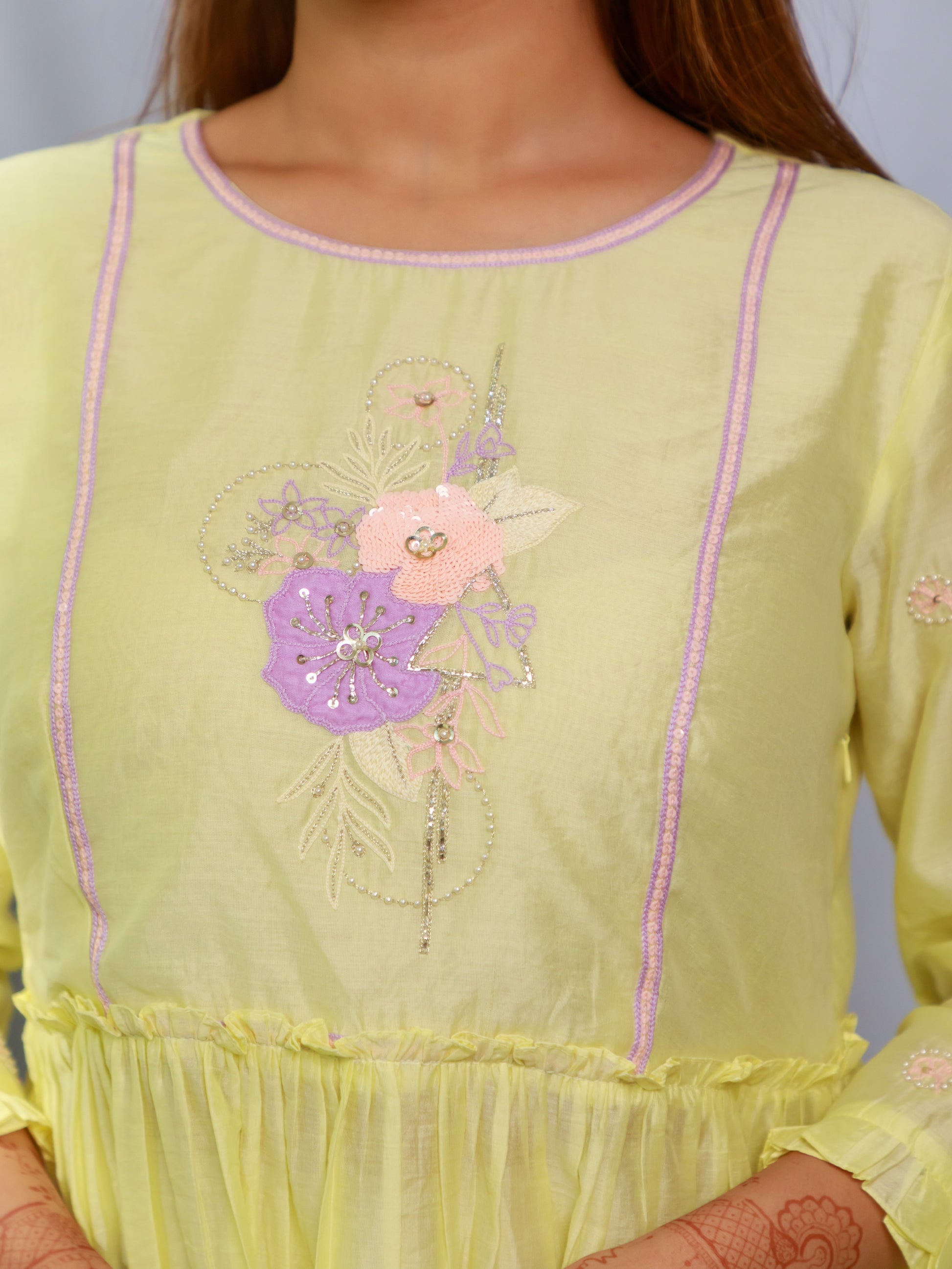 Introducing ISHTARA's LEMON YELLOW FRILL TOP WITH-OFF WHITE FLARED PANTS. Designed with a frill detail and flattering fit, this set is perfect for a stylish and comfortable look. Made with high-quality fabric, you can enjoy comfort and style while making a statement.